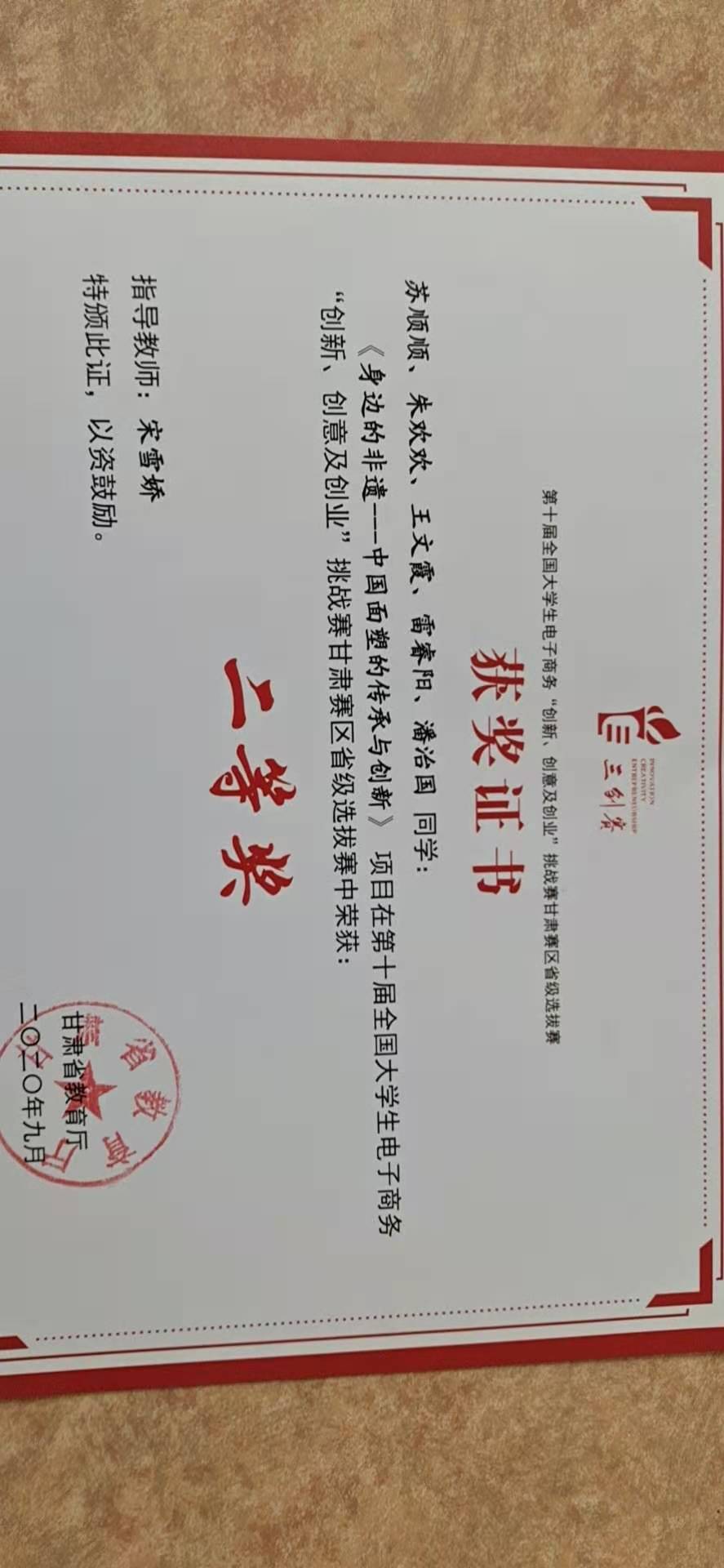 2020年指导学生参加寺世界全国大学生电子商务“创新、创意及创业”挑战赛甘肃赛区省级选拔赛中获得二等奖