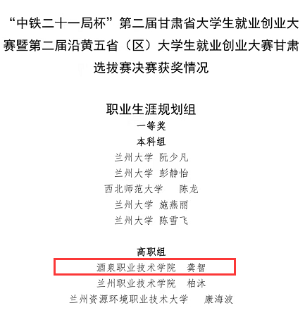 2021年12月10日——12日,由甘肃省教育厅主办、兰州交通大学承办、甘肃融创立方产业加速器协办的“中铁二十一局杯”第二届甘肃省大学生就业创业大赛暨第二届沿黄五省(区)大学生就业创业大赛甘肃选拔赛在兰州交通大学圆满结束。我校旅游与烹饪学院龚智同学获职业生涯规划高职组一等奖;化工学院的项目《定西农村土鸡窝飞出金蛋蛋》和新能源工程学院的项目《农家欢电子商务运营模式——家乡三农保障小分队》获创业实践高职组三等奖。