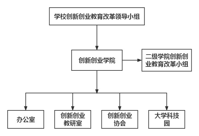 学校成立以校长为组长,分管副校长为副组长,由教务处牵头,学生处、团委、招生就业处等相关部门和各二级学院负责人为组员的学校创新创业教育改革领导小组。领导小组办公室设在创新创业学院。
