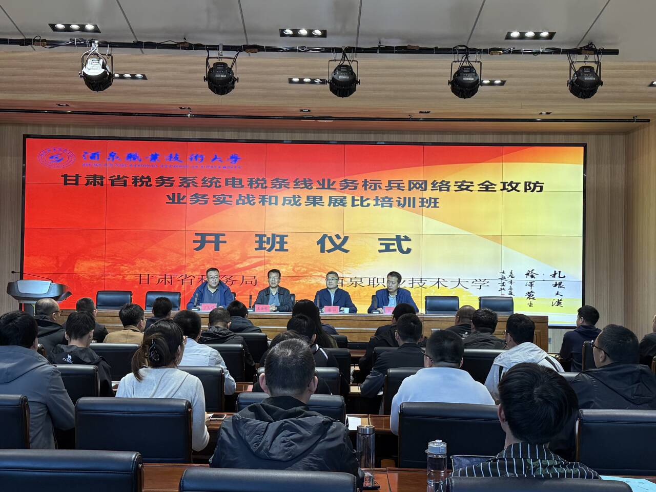 2025年5月7日上午,甘肃省税务系统电税条线业务标兵网络安全攻防业务实战和成果展比培训班开班仪式在酒泉职业技术大学隆重举行。本次培训由甘肃省税务局主办、酒泉职业技术大学经济管理学院承办,来自全省各地州市税务系统的35名信息中心骨干参加为期14天的专题培训。
