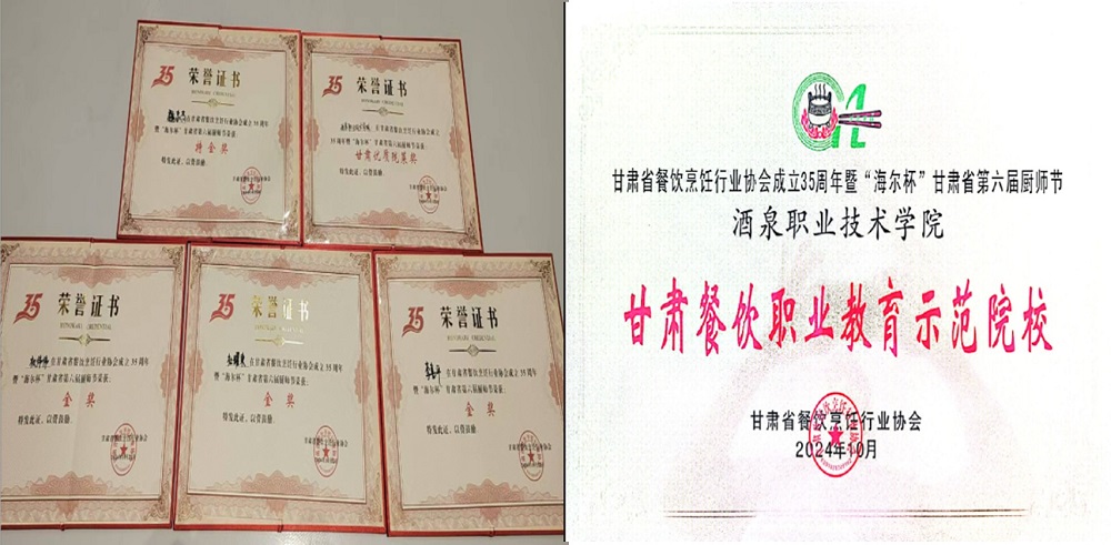 通过“生产性实训”学生从“新手””到“熟手”,提升了学生专业技能和职业素养。学生获2024年甘肃省第六届厨师节烹饪技能竞赛金奖3项,中式面点赛项金奖2项,学校被甘肃省餐饮烹饪行业协会评选为“甘肃省餐饮职业教育示范院校”。