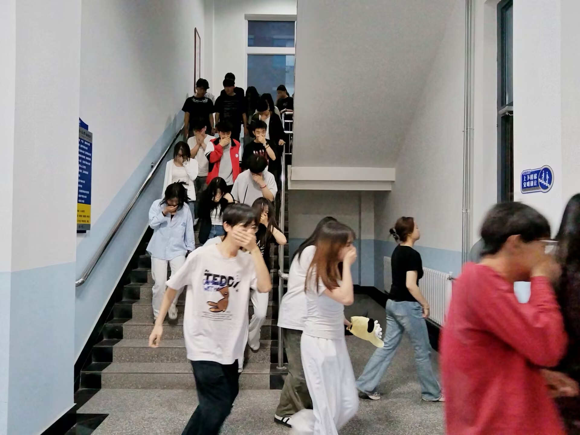 按照既定演练方案,第一阶段由班级组织开展应急逃生专题班会,学习应急技能,增强安全防护意识,强调演练安全和注意事项。20点45分,随着应急疏散哨声的响起,全体学生在老师、安全员疏引下,按照演练线路,快速、有序地完成撤离。