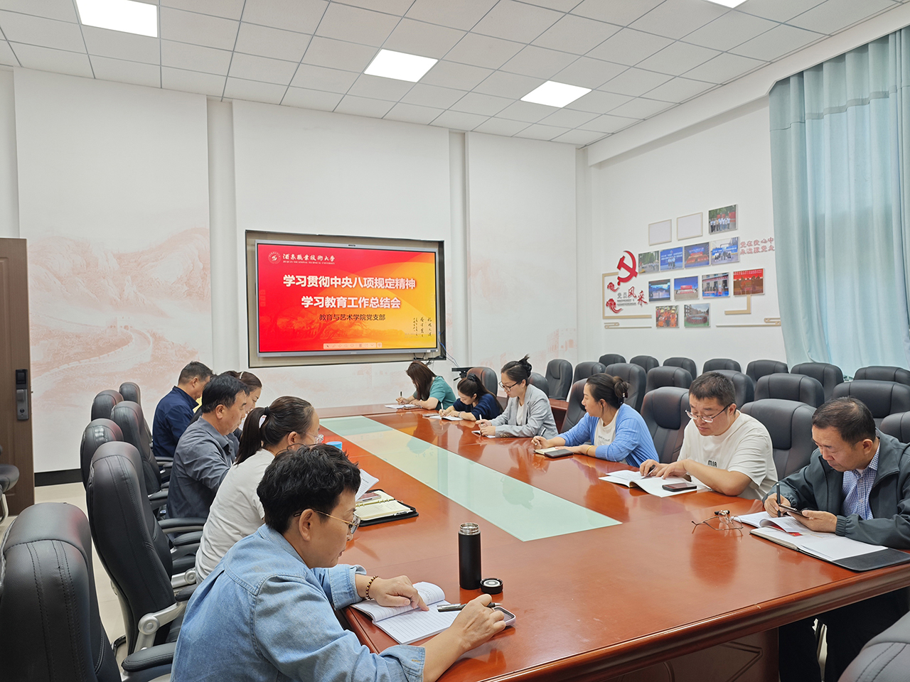 院系动态 > 正文为持续深化作风建设,凝聚学院高质量发展动能,2025年9月19日,教育与艺术学院在行知楼704会议室召开深入贯彻中央八项规定精神学习教育总结会议。学院全体党员参会,会议由党支部书记梁志红主持。
