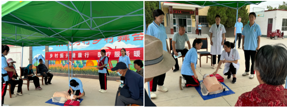 护理系组织的急救技能实操培训成为活动的另一大亮点。护理专业教师、志愿者现场演示了噎食抢救术、心肺复苏术等关键急救技能,并邀请村民亲身参与实践操作。