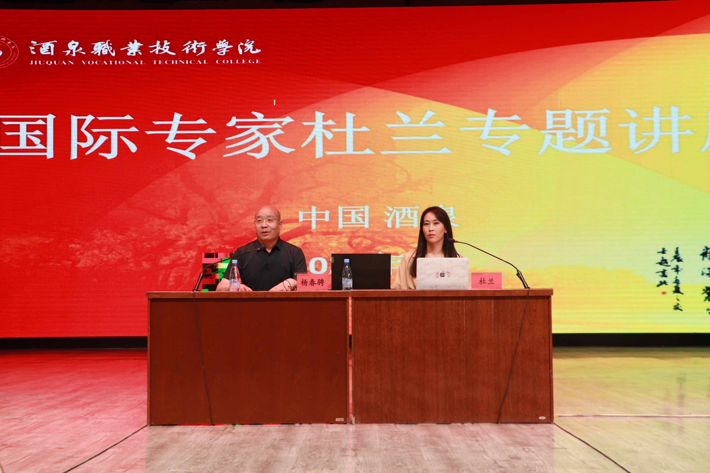 要闻快递 > 正文为践行国家“一带一路”战略,提升学校国际化水平,创新国际化人才培养模式,2024年6月15日上午,酒泉职业技术学院外国专家流动工作站特聘驻站专家、蒙古国自由作家杜兰女士应邀来校进行学术交流,并就《做“一带一路”与“草原之路”对接的使者》一题展开了专题讲座。讲座在学校胡杨文化活动中心成功举办,学校党委委员、副校长王立智教授、酒泉卫校副校长孙俊峰教授、学校国际交流处、学工部、团委、马克思主义学院、国际交流学院负责人、各二级学院分管学生工作副院长、团委书记及学生代表等近540余人参加了讲座。讲座由国际交流学院院长杨春骋副教授主持。