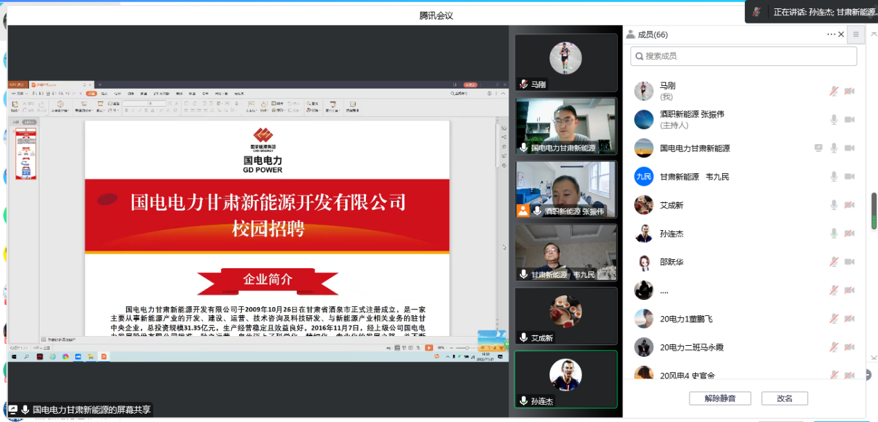 为提高我院毕业生就业质量,实现优质就业,2022年11月21日晚,新能源工程学院邀请国电电力甘肃新能源开发有限公司通过线上云平台为2020级未就业学生举办了专场招聘会。学院副院长张振伟主持会议;国电电力甘肃新能源开发有限公司党委书记、总经理韦九民,党委委员、副总经理邵跃华,安全生产部主任艾成新,规划发展部主任孙连杰,人事主管常强出席了线上会议。学院70名未就业学生积极参加了会议。
