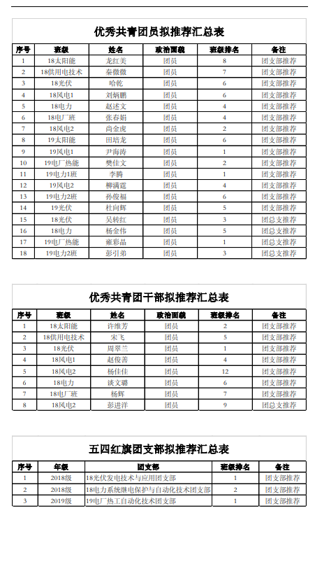 新能源工程学院2019年度优秀团干、优秀团员、五四红旗团支部公示