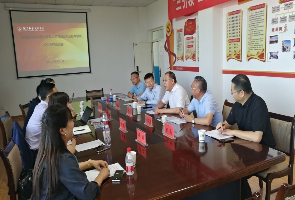 随后在致远楼319会议室开展座谈,双方就混合所有制学院建设、金风科技丰润中华助学方案实施、教学交流平台建设、师生员工定期互访、"1+X"证书培训等校企合作事项展开深入交流,并达成一致意见。