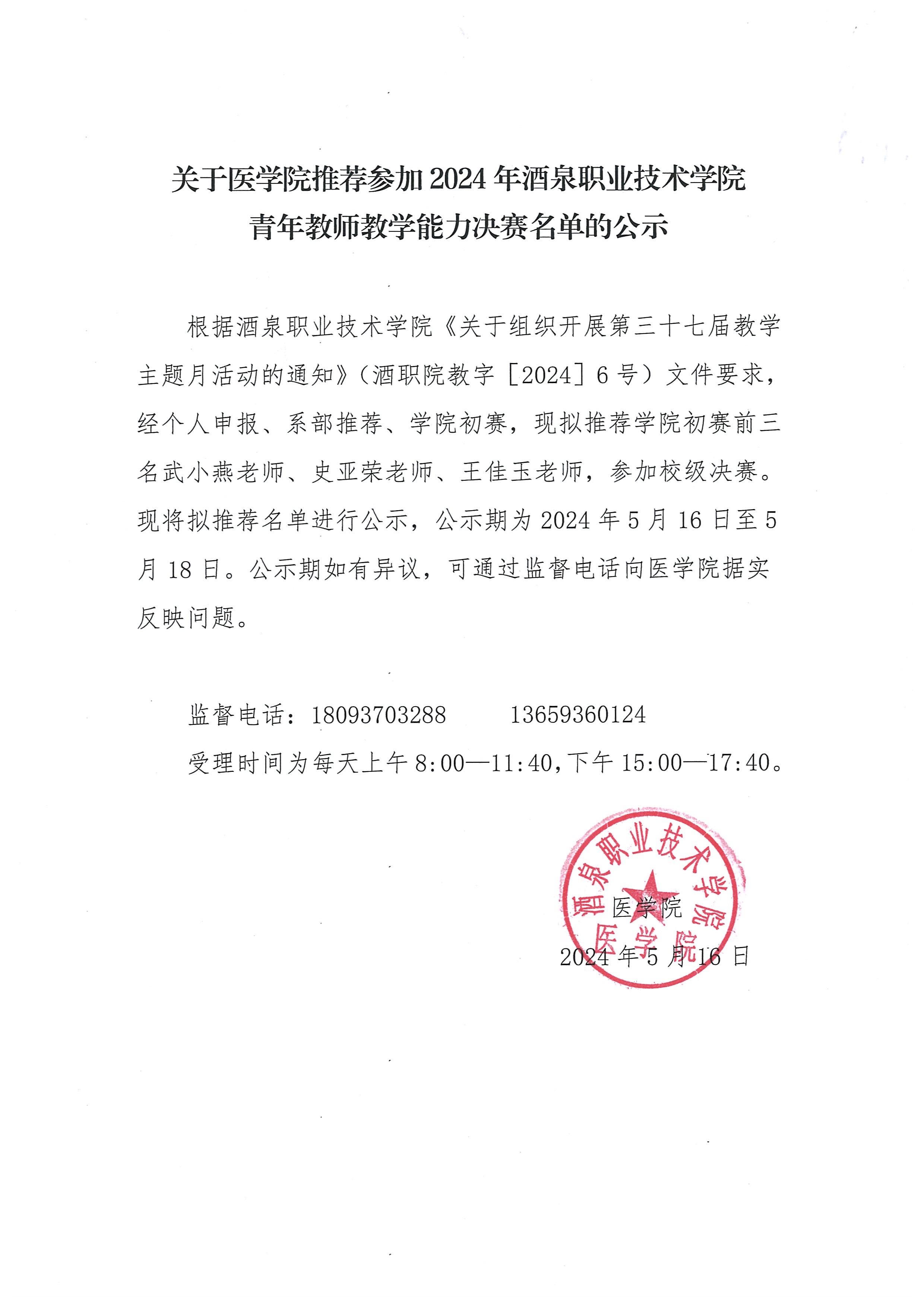 关于医学院推荐参加2024年酒泉职业技术学院青年教师教学能力决赛名单的公示