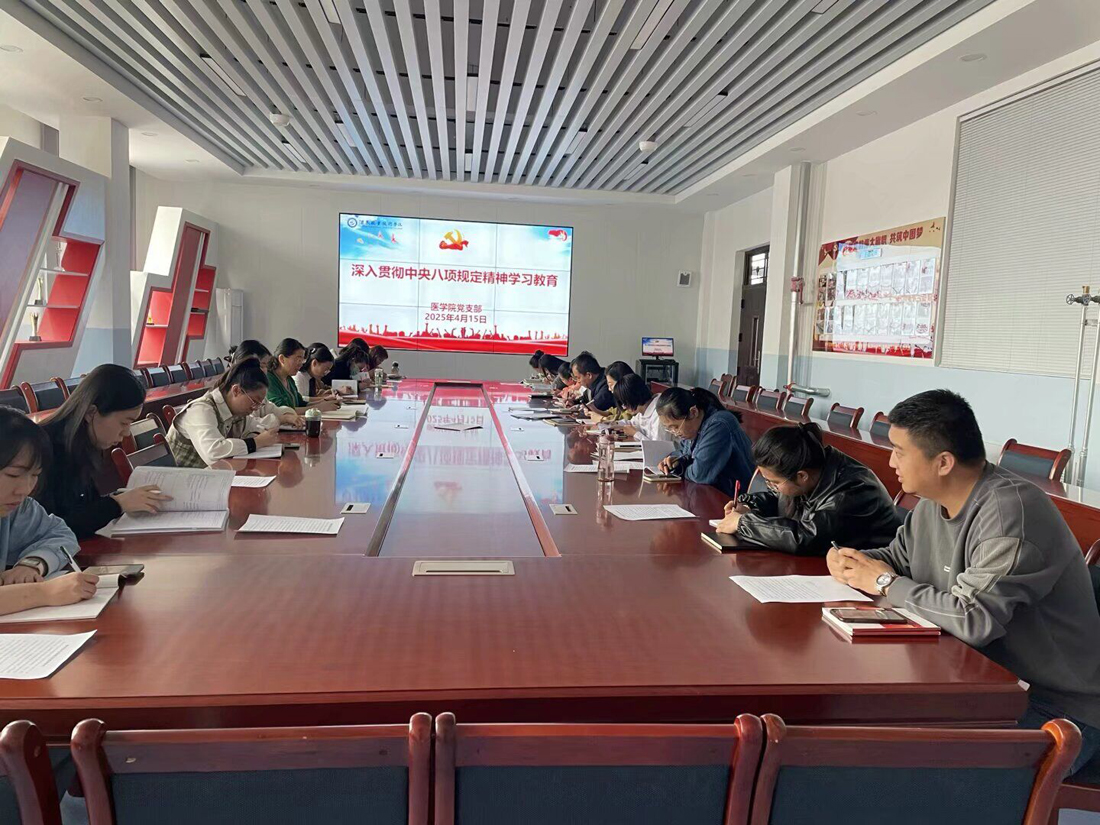 4月15日下午,医学院开展深入贯彻中央八项规定精神学习教育,深入学习习近平总书记关于加强党的作风建设的重要论述,会议由医学院党支部副书记段国萍主持,医学院全体教职工参加。