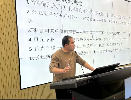 会上,于荣哉副院长结合学院近期赴新疆开展“访企拓岗促就业”专项行动的成果,围绕当前就业形势、政策支持、职业规划及就业方法等内容进行系统讲解。一是解读政策机遇,重点介绍新疆地区医疗卫生领域岗位需求及人才引进政策,鼓励学生把握国家区域发展战略机遇,拓宽就业视野;二是分析就业形势,结合医疗行业发展趋势和岗位竞争特点,引导学生理性认识就业环境,增强紧迫感和主动性;三是强化观念引导,强调树立“先就业、再择业”的务实理念,立足专业优势,科学规划职业发展路径;四是传授求职技能,从简历制作、面试技巧到职业信息获取渠道,全方位提升学生就业竞争力。