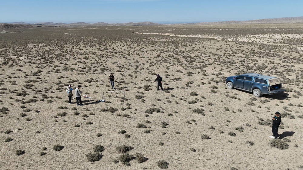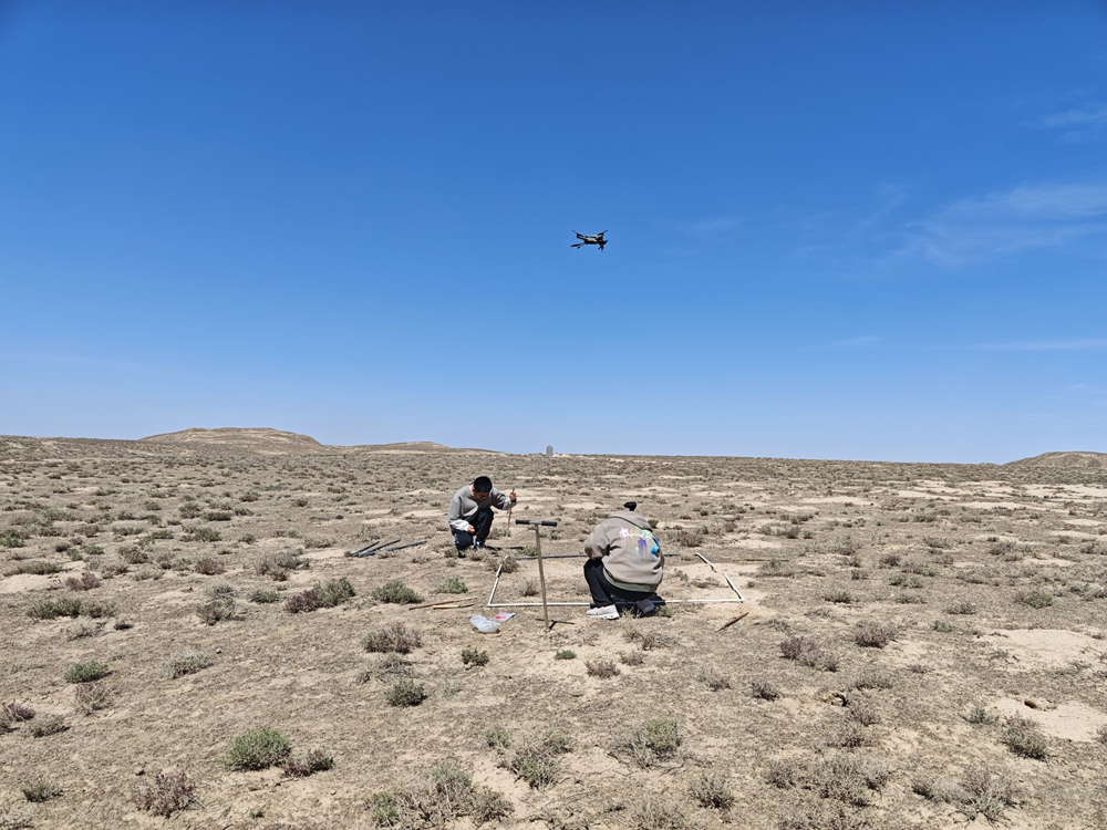调研期间,博士团队负责人王燕老师及团队成员与企业技术人员组成4人小组分队,在高台县林草局工作人员带领下,深入高台县新坝镇下坝村、暖泉村、照中村、红沙河村等10个村的荒漠草原退化片区展开调查。团队成员分工协作,完成植被高度、盖度、频度、物种数测量,区域土壤样品采集,同时利用无人机航拍技术,辅助分析植被分布格局。截至目前,团队已完成10个样地,14个样方的野外调查,采集土壤样品42份,植物标本15份,为后续检测报告撰写提供了基本数据支撑。