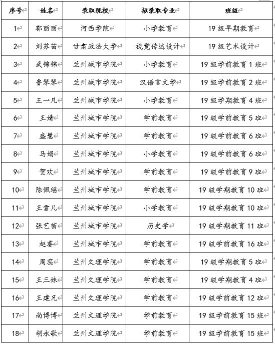 心田耕耘有矢志,硕果飘香又一年。截止3月11日,据2022年甘肃省普通高校高职(专科)专升本免试生招生第一轮录取信息查询结果显示,教育与艺术学院专升本免试报考学生27人,录取18人,报考录取率为66.67%,学生分别被甘肃政法大学、河西学院、兰州城市学院、兰州文理学院4所院校录取。
