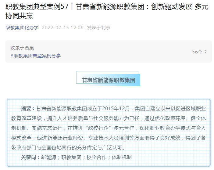 甘肃省新能源职教集团案例《创新驱动发展 多元协同共赢》入选全国职业教育集团化办学典型案例汇编