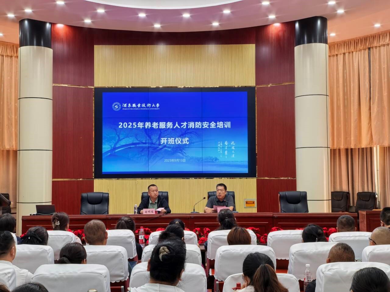 9月13日上午,2025年酒泉市民政局养老服务人才消防安全培训开班仪式在酒泉职业技术大学逸夫报告厅举行。酒泉市民政事务中心副主任谢明俊、酒泉职业技术大学继续教育学院院长、培训处处长张祥出席开班仪式,酒泉市各县(市、区)养老机构工作人员共52人参加开班仪式。活动由酒泉职业技术大学化工学院副院长田琨主持。